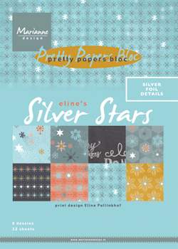 Ik ging aan de slag met het paperbloc Eline's Silver Stars, ontworpen door Eline Pellinkhof.Ik zocht daar bijpassende knipvellen van mezelf bij en ging er kaarten mee maken.